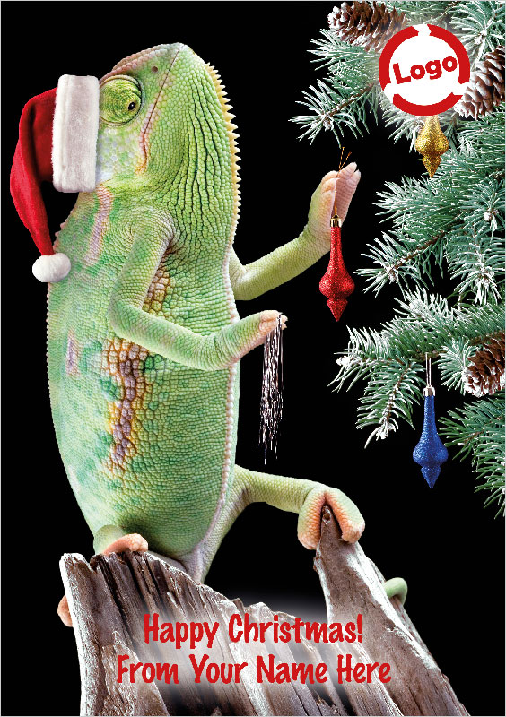 Christmas Chameleon are Gloss finished and suitable for corporate, business, company or personal use. 625-614 is a perfect choice for small to large companies. Our Christmas Chameleon Christmas cards are printed onto a premium thickness board, acquired only from sustainable sources and produced in the UK. Your inside personalisation is peronalised directly onto the card. Christmas Chameleon are sized at 148x210mm. Front Personalised Chritmas Card